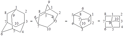 Молекула адамантана построена из четырех конденсированных циклогексановых колец в конформации кресла. Углеродный скелет молекулы адамантана повторяет структурную элементарную единицу кристаллической решетки алмаза. Встречается несколько изображений молекулы адамантана, из которых первое лучше всего отображает ее геометрию (Рис.1.1).
