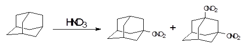 Реакции адамантана с бромом и серной кислотой отнесены к ионным реакциям, протекающим через стадию образования адамантильного катиона. Однако сведения о действии азотной кислоты на адамантан в ранних исследованиях отсутствуют если не считать работы Смита по нитрованию адамантана смесью азотной и уксусной кислот при 140 °С с образованием моно- и динитроадамантанов.