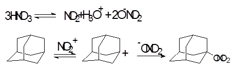 Изучение поведения адамантана в азотной кислоте и ее смеси с уксусной кислотой [9] позволило предложить механизм образования 1-нитроксиадамантана, включающий стадию генерации адамантильного катиона.