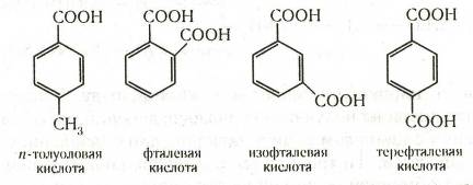 (п-толуолкарбоновая), фталевая (1,2-бензолдикарбоновая), изофталевая (1,3-бензолдикарбоновая), терефталевая (1,4-бензолдикарбоновая):