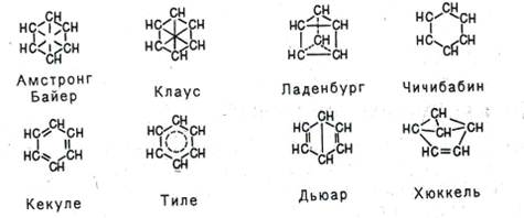 Пытаясь объяснить свойства бензола особенностями строения, многие ученые вслед за Кекуле выдвигали по этому поводу свои гипотезы. Поскольку непредельность бензола явно не проявлялась, считали, что двойных связей в молекуле бензола нет. Так, Армстронг и Байер, а также Клаус предположили, что в молекуле бензола четвертые валентности всех шести атомов углерода направлены к центру и насыщают друг друга, Ладенбург - что углеродный скелет бензола представляет собой призму, Чичибабин - что в бензоле углерод трехвалентен.