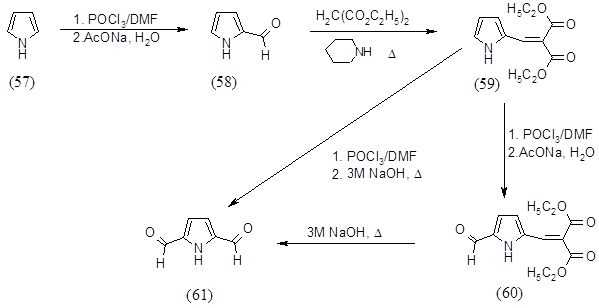 При гидролизе с применением 3М NaOH и кипячении в течение 1 часа образуется 2,5-диформилпиррол (61) с выходом 53%, который был охарактеризован спектральными методами и физико-химическими методами и имеет следующие характеристики: Rf = 0,3 (Хл:МеОН 9:1); ТПЛ = 112–1140; ПМР d (м.д.): 7.02–д. (2H; CH, J=2 Гц); 9.77‑с. (2H; CHO); 10.38‑уш.c. (1H; NH); ИК (вазелиновое масло) n (cм‑1): 3140, 1720, 1700. Масс-спектр m/z (%): 123 (65%), 94 (18%), 66 (60%), 39(100%).