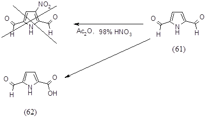 Полученный 2,5-диформилпиррол (61) предполагалось пронитровать в b-положение. В качестве нитрующего агента использовали смесь 98% HNO3 и уксусного ангидрида. По литературным данным известно, что пиррольный цикл, содержащий акцепторные группы должен быть устойчив в указанных условиях. Действительно разрушения цикла не происходило, однако одна из альдегидных групп окислилась, о чем свидетельствует спектр ПМР выделенного продукта (62): ПМР (CDCl3-CD3OD) d (м.д.): 6.15–д. (1H; CH, J=4 Гц); 6.68–д. (1H; CH, J=4 Гц); 7.94‑с. (1H; CHO).