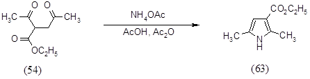 Поэтому было решено проводить реакцию нитрования 2,5-диметил-3-карбоэтоксипиррола (63). Данный пиррол был получен конденсацией ацетонилацетоуксусного эфира (54) ацетатом аммония в смеси уксусной кислоты и уксусного ангидрида при комнатной температуре в течение 20 минут с выходом 76%, характеристики полученного продукта совпали с литературными данными [84].