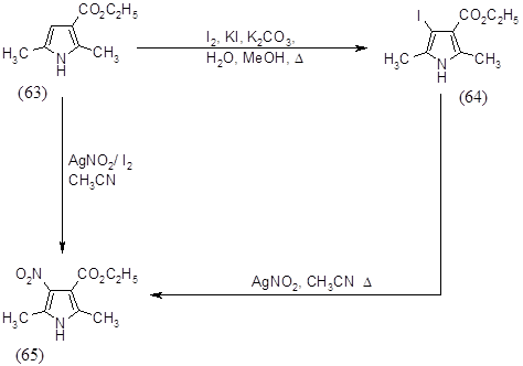 Реакцию замещения йода на нитрогруппу проводили при кипячении 2,5-диметил-3-йод-4-карбоэтоксипиррола (64) с нитритом серебра в ацетонитриле в течение 2 часов, выход 2,5-диметил-3-карбоэтокси-4-нитропиррола (65) составил 47%. Таким образом, второй метод оказался более предпочтительным, так как суммарный выход по этому способу составляет 37%, а по первому методу - 18%.