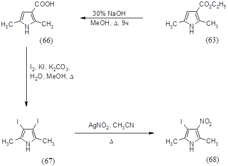 Реакцию замещения йода на нитрогруппу проводили по отработанной методике - при обработке 2,5-диметил-3,4-дийодпиррола (67) с нитритом серебра в ацетонитриле в течение 24 часов при комнатной температуре. В результате хроматографирования на колонке с силикагелем, было выделено 3 продукта (А, Б, В), которые были проанализированы с помощью Н1‑ЯМР спектроскопии. ПМР (CD3OD) d (м.д.): (А)‑ 2.21-с.(1Н); 2.54-c. (1H). (Б)- 1.45-c.(4H); 1.47-c.(18H); 2.18-c.(6H); 2.41-c.(4H); 3.35-c.(4H). (B)-1.43-c.(9H); 1.46-д.(2H); 1.62-c.(1H); 1.87‑c.(1H); 1.98-д.(2H); 2.42-c.(3H); 3.34-c.(3H); 6.51-c.(3H).