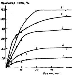 Рис. 4. Зависимость количества сорбированной на ПКА-волокне МАК от концентрации МАК в растворе и продолжительности обработки. Т= =333 (1-3) и 343 К (4, 5). [МАК]=0,69 (1); 0,93 (2); 1,16 (5); 0,69 (4) и 0,93 моль/л (5)