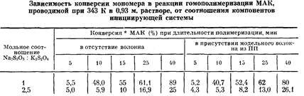 С целью выяснения особенностей прививочной полимеризации МАК к ПКА-волокну, протекающей с относительной высокой скоростью и не сопровождающейся отдельно образованием гомополимера, была исследована реакция гомополимеризации МАК в аналогичных условиях в отсутствие волокна, а также в присутствии модельного ПП-волокна (в принятых условиях реакция передачи цепи на ПП не протекает).