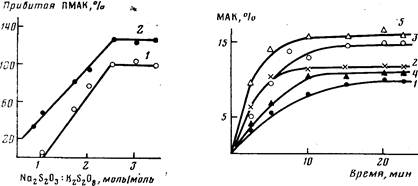 Следует отметить, что в отличие от обычно используемых ОВС, в которых соотношение окислитель: восстановитель составляет, 1: (1—0,5), необходимым условием для инициирования прививочной полимеризации без образования гомополимера системой K2S2О8—Na2S2О3 как в присутствии, так и в отсутствие ионов меди является значительный избыток восстановителя. Согласно полученным данным (рис. 3), при значениях Na2S2О3: : K2S2О8 ниже 1,7 в реакционной системе параллельно с прививочной полимеризацией протекает и гомополимеризация прививаемого мономера. Количество образующейся при этом ПМАК уменьшается по мере увеличения мольного соотношения восстановитель: окислитель. Оптимальное соотношение, при котором достигается максимальная эффективность прививки и выход привитого сополимера без образования гомополимера составляет 2,5. На основании этих данных можно сделать вывод о том, что первичные радикалы S04~ и ОН, отличающиеся очень высокой абсолютной константой реакции инициирования гомополимеризации МАК [8], быстро гибнут в растворе в результате протекания реакции с S2О32~. Этому способствует высокая концентрация Na2S2О3 в растворе и его значительно** лучшая растворимость в воде по сравнению с K2S2Оs, хорошо сорбируемым на волокне. Образующийся при разложении инициатора тиосульфатный ион-радикал S2Os*_, как известно [9], малоактивен в реакции инициировании, и его дальнейшие превращения приводят к образованию неактивных продуктов [7].