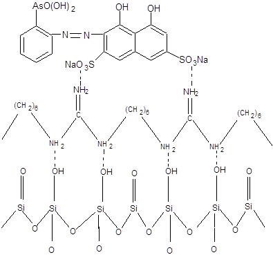 Сорбенты получали методом последовательного закрепления на поверхности силохрома С-120 полигексаметиленгуанидин гидрохлорида (ПГМГ ГХ) с концентрациями 0,1 и 1 г/л и органического реагента арсеназо I (рисунок 3).