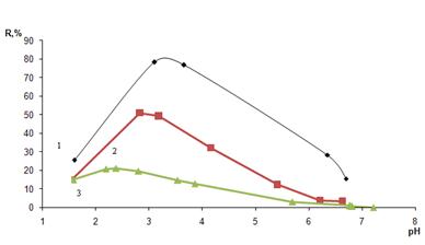 Рассчитывали степень извлечения (формула 1) и строили зависимость в координатах: степень извлечения (R, %) – кислотность среды (pH) (рисунок 4).