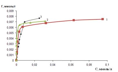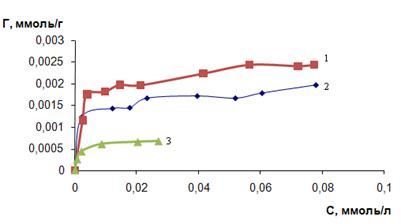 Как видно из ниже приведенного рисунка, при концентрации полигуанидинов 1 г/л, сорбционная емкость трех сорбентов практически одинакова и составляет 7 мкмоль/л. Вероятнее всего, это свидетельствует о том, что при данной концентрации полимеров, в растворах содержится достаточное количество олигомеров, прочно удерживаемых на сорбенте, и при этом они занимают всю поверхность сорбента.