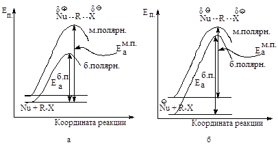 Рис.2.3. Влияние полярности растворителя на скорость SN2: а - повышение полярности растворителя стабилизирует АК в большей степени, чем исходное соединение, энергия активации уменьшается, скорость реакции увеличивается, б - повышение полярности растворителя стабилизирует исходную систему в большей степени, чем АК, энергия активации увеличивается, скорость реакции уменьшается.