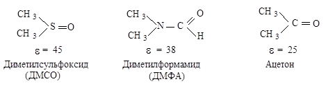 Наиболее подходящими для синтеза соединений и изучения механизма SN2 являются апротонные биполярные растворители, т.е. растворители с высокой диэлектрической проницаемостью, но не способные к образованию водородных* связей: