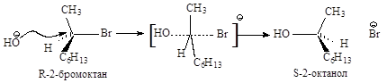 Конфигурация исходного 2-бромоктана при атаке хирального атома углерода с тыла меняется на противоположную, молекула субстрата выворачивается. Полное обращение конфигурации хирального углерода может служить доказательством SN2-механизма.