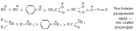 Сила нуклеофила. Нуклеофил - частица, имеющая пару электронов, которую она может отдать атому углерода, несущему целый или частичный положительный заряд. Чем сильнее атом удерживает пару электронов, тем меньше его способность выступать в качестве нуклеофила.