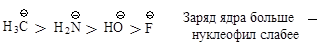 Нуклеофильный реагент, предоставляющий пару электронов электронодефицитному атому углерода, способен подавать эту пару атому водорода и отщеплять его, превращаясь в кислоту, т.е. каждый нуклеофильный реагент является основанием. Нуклеофильная реакционная способность и основность изменяются параллельно у реагентов, в которых пара электронов находится на одном и том же атоме или неподеленная пара электронов находится у атомов элементов, принадлежащих одному периоду.