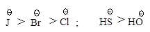 Такой порядок изменения нуклеофильности в протонном растворителе объясняется тем, что анионы разного размера в протонном растворителе в различной степени сольватированы за счет образования водородных связей: анион малого размера с концентрированным зарядом сольватируется сильнее и стабилизирован в большей степени, чем анион большего размера, в котором отрицательный заряд распределен в большей степени.