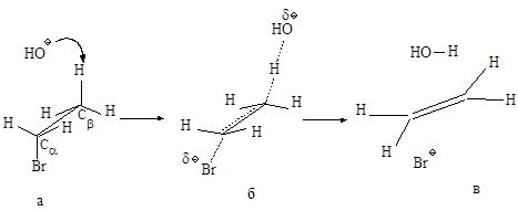 Рис.2.6. Механизм реакции бимолекулярного элиминирования; а – антикомпланарное расположение связей Сa—Br и Сb—H, б – переходное состояние, в – конечные продукты.