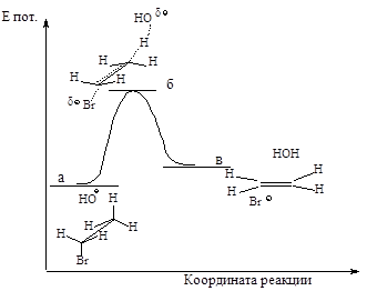 Механизм Е2. Основание НО–атакует водород (рис.2.6.а) при Сb, подает ему пару электронов и начинает образовывать с ним связь, связь Сb-Н ослабевает, пара электронов, связывавшая углерод и водород, освобождается и атакует атом галогена с тыла., одновременно растягивается связь Сa -Br (процесс согласованный). Возникает активированный комплекс: атомы углерода Сa и Сb переходят из sp3-гибридного состояния в состояние, близкое к sp2-состоянию, освобождающаяся пара электронов затрачивается на образование p-связи (рис.2.6.б) . Затем связи углерод- водород и углерод-галоген разрываются, атомы углерода переходят в sp2-состояние, образуется p-связь (рис.2.6.в).