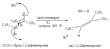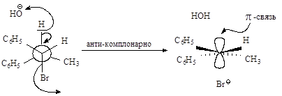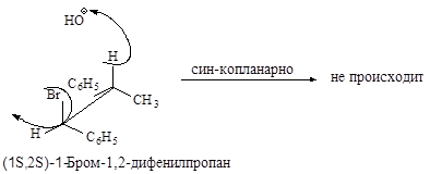Связи, разрывающиеся в активированном комплексе, должны быть в транс-положении друг к другу. Такая геометрия позволяет электронной паре, освобождающейся при связывании протона с основанием, атаковать с тыла атом углерода Сa и вытеснять галоген. Копланарность двух связей субстрата: Сa -Br и Сb -Н, которые разрываются в активированном комплексе, обеспечивает максимальное перекрывание р-орбиталей, то есть способствует процессу образования p-связи. Такая комбинация условий называется стереоэлектронным требованием.