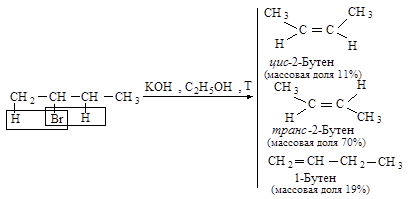 Основным продуктом реакции элиминирования 2-хлорбутана является транс-2-бутен (соотношение цис- и транс-изомеров 1:6). Активированный комплекс, возникающий при образовании транс-изомера, менее пространственно затруднен и более устойчив, и, следовательно, скорее образуется, чем активированный комплекс, ведущий к цис-изомеру.