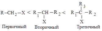 Реакционная способность галогеналканов увеличивается при переходе от первичных к третичным. Это обусловлено увеличением устойчивости карбокатионов, образующихся в медленной стадии.