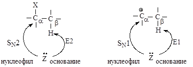 В реакциях замещения донор электронной пары отдает свою пару электронов атому углерода Сa, связанному с галогеном - в этом случае он является нуклеофилом. Тот же донор электронов может отдавать свою электронную пару атому водорода, связанному с Сb - в этом случае он является основанием в реакциях элиминирования.