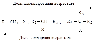 Реакции элиминирования и нуклеофильного замещения в этом случае являются конкурирующими. При переходе от первичных ко вторичным и далее третичным галогеналканам элиминирование происходит все в большей степени.