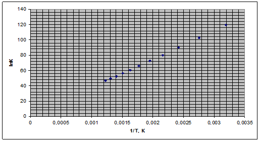 Рис. 4. Зависимость логарифма константы равновесия от обратной температуры.