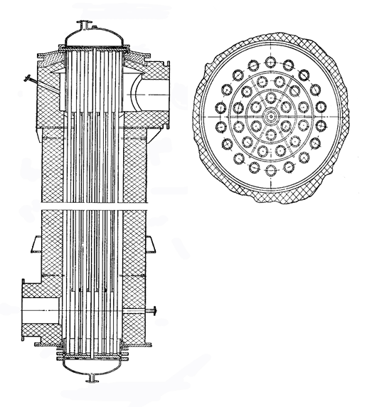 Практически температура в топке не превышает 1000-11000 С. Однако при такой температуре возможен перегрев катализатора и разложение продуктов реакции. Поэтому в верхней части топки топочные газы смешивают с газами, возвращаемыми из борова печи, с таким расчетом, чтобы температура газа была выше 500-5500 С. Газ, имеющий такую температуру, проходит в межтрубном пространстве контактного аппарата прямотоком к парам циклогексанола, движущимся по трубкам с катализатором. Противоток в данном случае недопустим, так как при этом наиболее горячие топочные газы соприкасались бы с парами образовавшегося циклогексанона, вызывая его разложение. Особенностью конструкции контактного аппарата (рис. 10) является наличие в его межтрубном пространстве трех концентрических экранных перегородок, благодаря которым достигается равномерный обогрев контактных трубок. Трубки привариваются к трубным решеткам; благодаря установке в нижней части аппарата специального сальникового устройства трубки при разогревании могут свободно удлиняться. Чтобы предотвратить каталитическое действие железа, которое может вызывать расщепление циклогексанола и усиленное сажеобразование, крышки и контактные трубки изнутри покрывают медью.