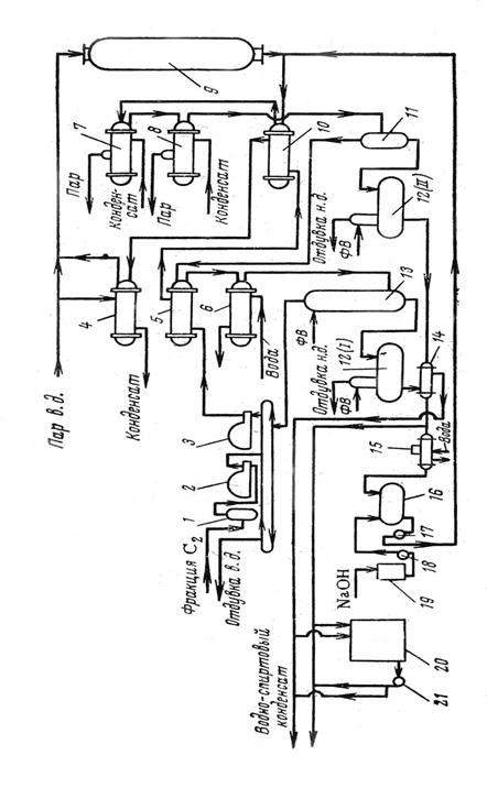 1 - буфер; 2 - компрессор свежего этилена; 3 - компрессор циркулирующего газа; 4 - паровой подогреватель; 5, 10, 14 - теплообменники; 6, 15 - холодильники; 7,8 - котлы-утилизаторы, 9 - реактор; 11 - сепаратор; 12(1), 12(11) - газоотделители; 13 - скруббер; 16, 20 - ёмкости; 17, 18, 21 - насосы; 19 - сборник; ФВ - фузельная вода