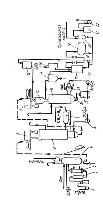 1 – воздуходувка; 2 – осушитель; 3 – паровой подогреватель; 4 – пропарочный аппарат; 5, 9 – полигональные сита; 6 – прокалочная печь; 7 – топка; 8, 13 – вентиляторы; 10 – пропиточная ванна; 11 – сушилка; 12 – бункер; 14 – отстойник; 15, 16 – сборники; 17 – смеситель; 18 – насос; 19, 20 – ёмкости; 21 – щелочной гидролизатор; 22 – вакуум-насос; 23 – калорифер; 24 – сито «Ротекс».