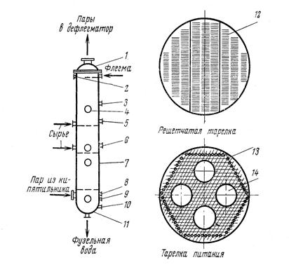 1 – крышка; 2, 3, 5, 6, 9 – штуцеры для термопар; 4 – люки; 7 – корпус; 8, 10 – штуцеры для замера уровня в кубе; 11 – днище; 12 – прорези; 13 – отверстия для слива жидкости; 14 – отверстия для прохода паров.