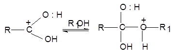 2) Катион взаимодействует с молекулой спирта по не поделенной электронной паре атома кислорода, образуя оксониевый ион: