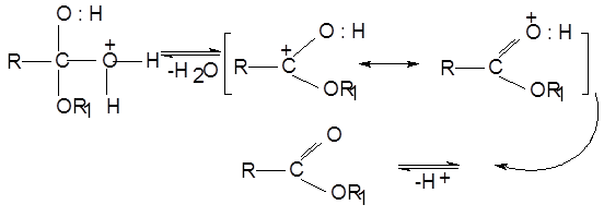 4) Оксониевый ион последовательно выделяет молекулу воды и протон, давая сложный эфир:
