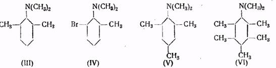 Диметилмезидин (V) и диметиламинопентаметилбензол (VI) также не способны к образованию четвертичных аммониевых соединений