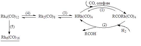 Кластер Rh4(CO)12 при взаимодействии со смесью СО и Н2 превращается в активный HRh(CO)4, а кластер Rh6(CO)16 – уже нет. Предполагают, что свободный HRh(CO)4 принимает участие в стадиях (4) и (5). Таким образом, более активный олефин, ускоряя процесс перехода HRh~ в RCORh, уменьшает концентрацию HRh~ и тем самым “защищает” катализатор от дезактивации. Аналогичная картина имеет место и для фосфиновых комплексов родия.