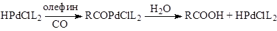 В случае олефинов активными являются гидридные комплексы палладия HPdClL, и схема механизма напоминает схему оксосинтеза