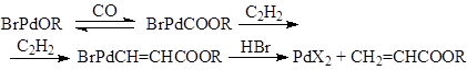 Механизм гидрокарбалкоксилирования ацетилена в растворах комплексов цис-PdBr2[P(OPh)3]2 отличается от схемы (9) – в этой системе активными комплексами являются комплексы Pd(II) (упрощенная схема):