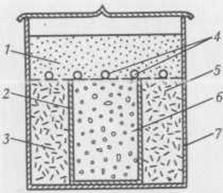 Интересен метод синтеза изумруда, разработанный японскими исследователями Хиронаса и Сэйдзо. Установка представляет собой платиновый тигель с горизонтальной платиновой отбойной перегородкой. Нижняя часть тигля разделена цилиндрической платиновой стенкой (рис. 3). Смесь из любых двух компонентов (SiO2, A12O3, ВеО2) помещают в кольцевое пространство, третий компонент – в центральную часть. В верхней части отбойной перегородки размещают затравочные кристаллы. Затем в реактор вводят растворитель из молибдата лития или пятиокиси ванадия и всю систему равномерно нагревают до температуры выше точки плавления каждого из компонентов смеси. Когда температура каждой из изолированных компонентов смеси становится выше точки плавления растворителя, начинается плавление. В результате диффузии компоненты поднимаются к затравочным кристаллам, проходят через отбойную перегородку и смешиваются в верхней части. После этого начинается процесс роста изумрудов на затравках.