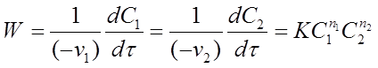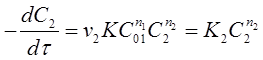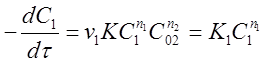 Если удастся определить величины п1 и п2 , то можно будет найти общий порядок реакции по формуле (24) и константы скорости К1 и К2 , а затем константу скорости реакции по формуле: