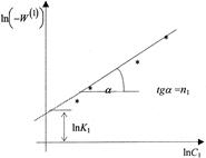 опытные точки для разных моментов времени, в случае справедливости уравнения (28) должны расположиться на прямой линии (рисунок 6). Отрезок на оси ординат дает значение lnК1, а тангенс угла наклона а прямой линии равен порядку п1 по первому веществу.