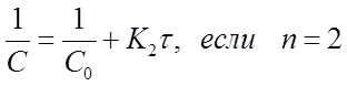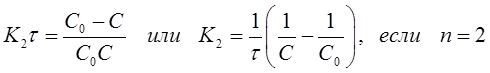 Подстановкой в эти уравнения опытных значений концентраций С исследуемого вещества, в разные моменты времени протекания реакции, вычисляют значения К. Если расчетные К, например, по уравнению (31) остаются постоянными, то это означает, что порядок реакции по веществу равен двум.