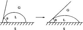 Капля жидкости, помещенная на твердую поверхность, может растекаться по ней таким образом, что площади поверхностей жидкость-твердое тело и жидкость-газ увеличатся. При этом площадь поверхности твердое тело-газ сократится, а краевой угол и между каплей и поверхностью твердого тела уменьшится.