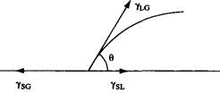 Растекание продолжается до тех пор, пока система не достигнет равновесия. Степень растекания контролируется поверхностным натяжением жидкости Ylg, поверхностным натяжением твердого тела Ysg и межфазным натяжением на границе жидкость-твердое тело Ysl- Возникающие при этом силы показаны на рис. 2.