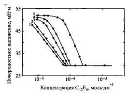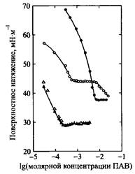 Зависимость поверхностного натяжения от концентрации ПАВ изменяется при введении белка подобно тому, как это происходит при введении в растворы ПАВ слабополярных гомополимеров. Так, представленная на рис. 1 зависимость поверхностного натяжения растворов додецилсульфата натрия в присутствии желатина. На зависимости поверхностного натяжения от концентрации ПАВ появляется излом задолго до KKM5 затем наблюдается плато, после которого происходит дальнейшее уменьшение поверхностного натяжения до значений, близких для растворов индивидуального ПАВ. В случае неионогенных ПАВ желатин не влияет на ход изотермы поверхностного натяжения. Однако для глобулярных белков изменение хода изотерм поверхностного натяжения четко свидетельствует о взаимодействии между белком и НПАВ.