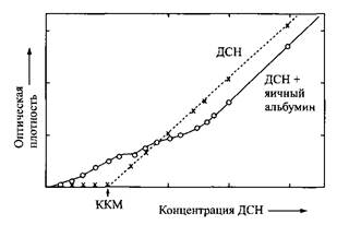 При введении в раствор лизоцима небольших добавок ДСН образуется нейтральный комплекс в виде твердого вещества, находящийся в равновесии с избытком белка в растворе. Количество осажденного белка достигает максимального значения, когда связывание ДСН лизоцимом становится равным 8 молекулам ДСН на одну молекулу белка, т.е. точно равным числу положительных зарядов в молекуле лизоцима. При значительном избытке ПАВ осадок растворяется. Чем короче алкильные цепи ПАВ, тем больше должна быть его концентрация для растворения осадка. Растворение осадка отвечает кооперативной части изотермы связывания в условиях, когда концентрация свободного ПАВ достигает KKM.