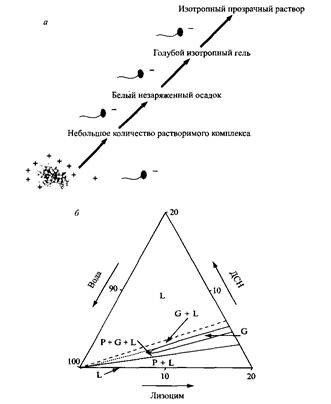 Рис. 9. а — Последовательность изменений свойств образцов при добавлении додецилсульфата натрия в раствор лизоцима б — Фазовая диаграмма, схематически показаны области существования раствора, геля и осадка, а также двух- и трехфазные области