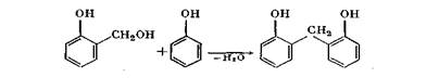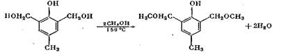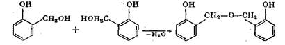 При взаимодействии оксиметилфенолов друг с другом возникают диметилэфирные связи. Реакция сопровождается внутримолекулярным отщеплением воды с образованием диоксидибен-зилового эфира: